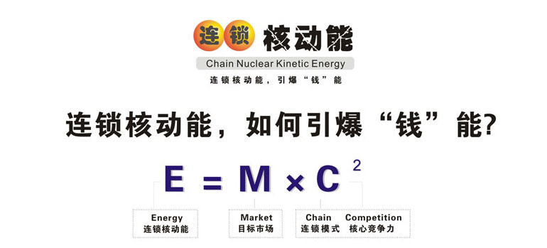 ,這是世界著名的愛因斯坦能量公式?;趷垡蛩固沟南鄬φ摵湍芰抗剑a生了原子彈和核電站,今天的人類太空實踐證實了愛因斯坦理論的正確性,人類因此發生了翻天覆地的變化。在愛因斯坦的能量公式中,M是質量,C是光速,當速度為光速時,即使很小的質量也能轉化為非常大的能量。 廣州采納企業管理顧問有限公司首席咨詢師陳宏創建的的連鎖核動能理論(全名:連鎖內核能量裂變激增理論)是以愛因斯坦的能量公式為基礎創建,但其含義和指向是不同的:M=目標市場(Market),C1=連鎖模式(Chain),C2 =核心競爭力(Competition),其理論意義是,企業找準了目標市場,以連鎖的方式經營,核心競爭力越大,推動其發展能量就越大。 連鎖核動能理論如何幫助連鎖企業“引爆錢能”快速發展?我們用深入淺出的圖形表達方式對該理論進行分層闡述: